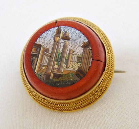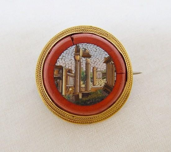 アンティーク■K14金 マイクロモザイク グランドツアー ブローチ 19世紀中期〜後期