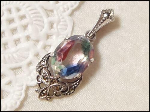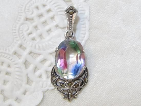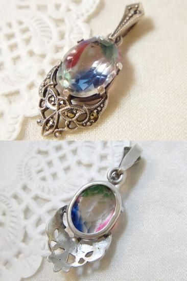 ドイツ製アンティーク 大粒アイリスガラスとマルカジットのミル打ちペンダントトップ/チャーム