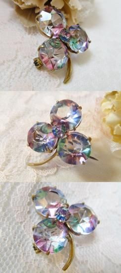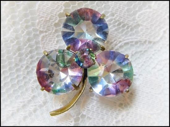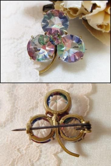 アンティーク アールデコ 古いアイリスガラス 虹色のクローバー ブローチ